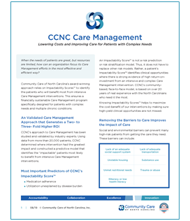 CCNC excels in improving care and reducing costs for patients with complex health needs, especially those with multiple chronic conditions who can encounter numerous barriers to better health. CCNC's targeting of "impactable" patients puts care management resources where they can do the most good for patients -- positively impacting outcomes, and helping to reduce costs.