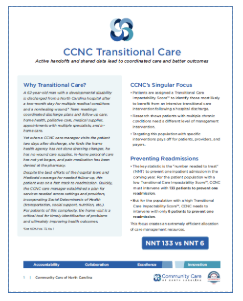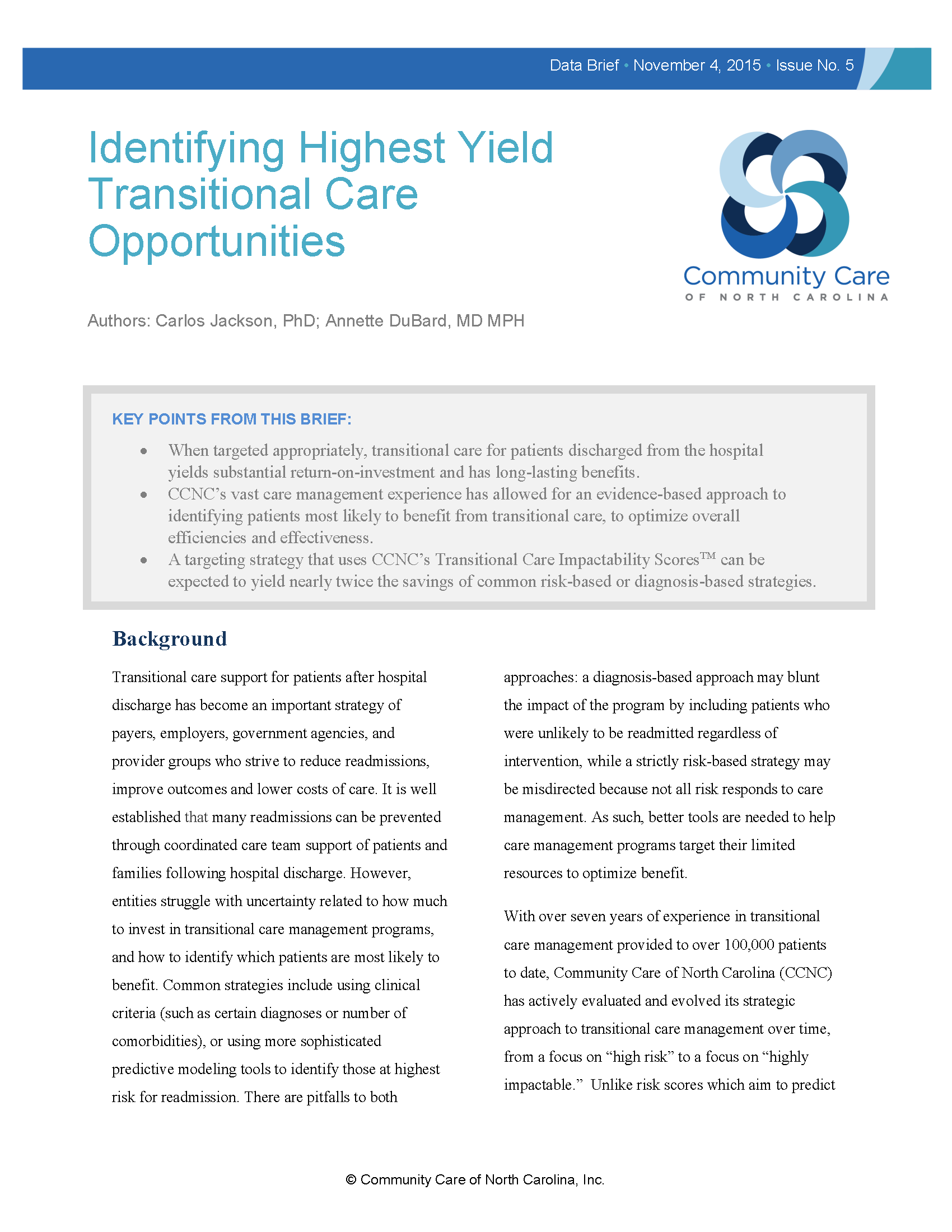 CCNC’s statewide approach assigns patients a Transitional Care Impactability Score™ to identify those most likely to benefit from an intensive transitional care intervention following a hospital discharge. Targeting this population with specific interventions pays off for patients, providers, and payers.